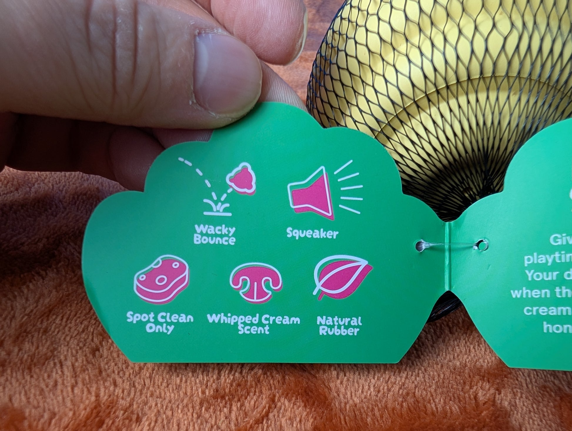 Super chewer, rubber, squeaker, whipped cream scent, wacky bounce
