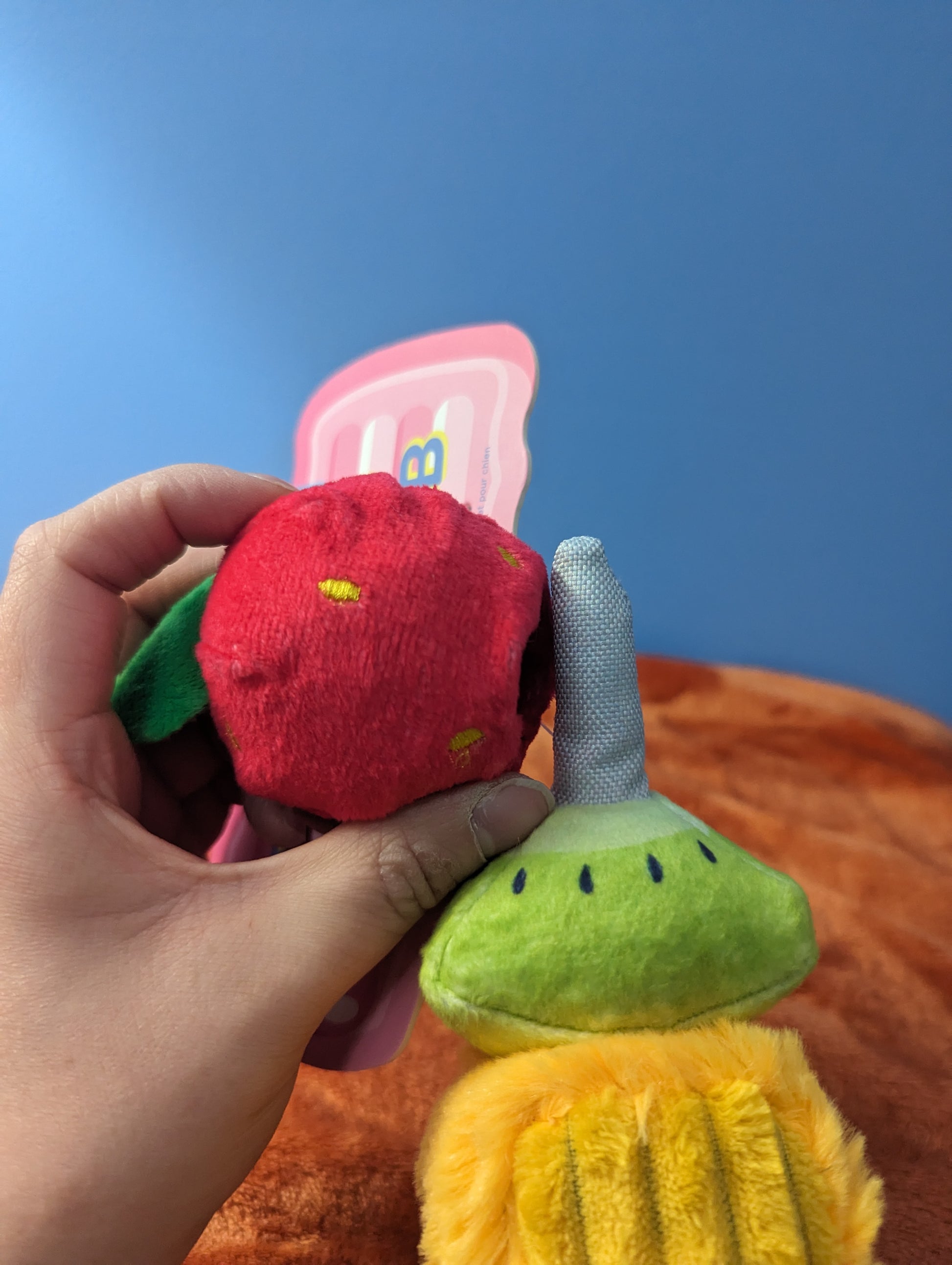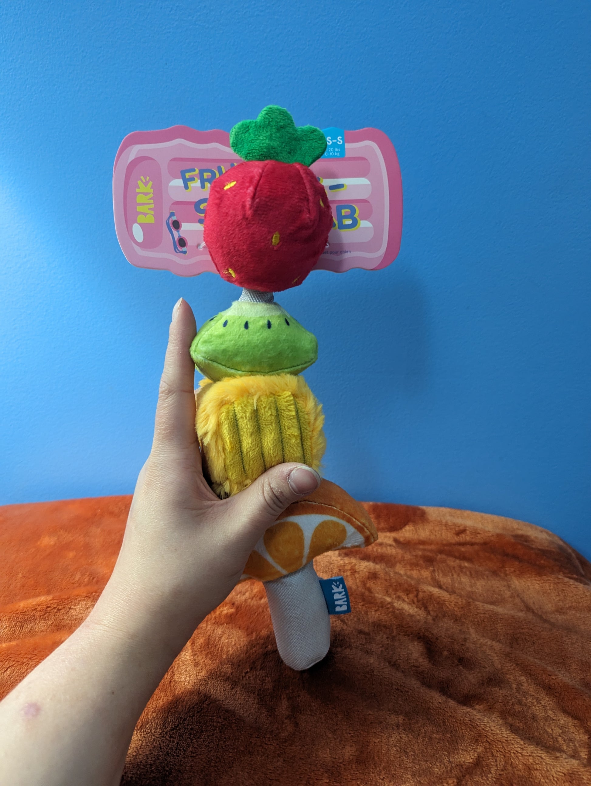 Squeaker, crinkle, multi-part toy (strawberry can be removed from skewer)