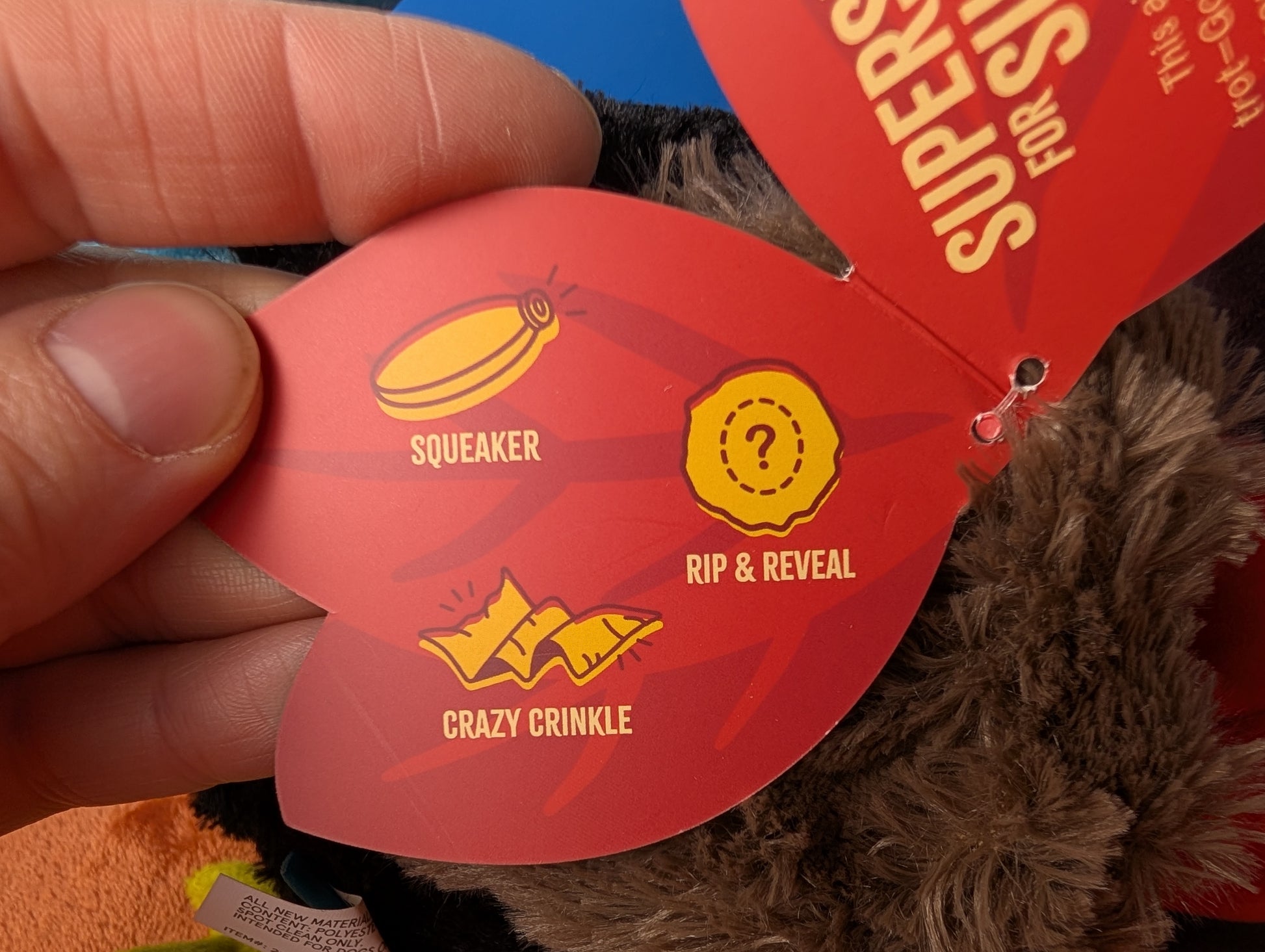 Squeaker, crinkle, hidden toy inside ("Tums" see last photo)
