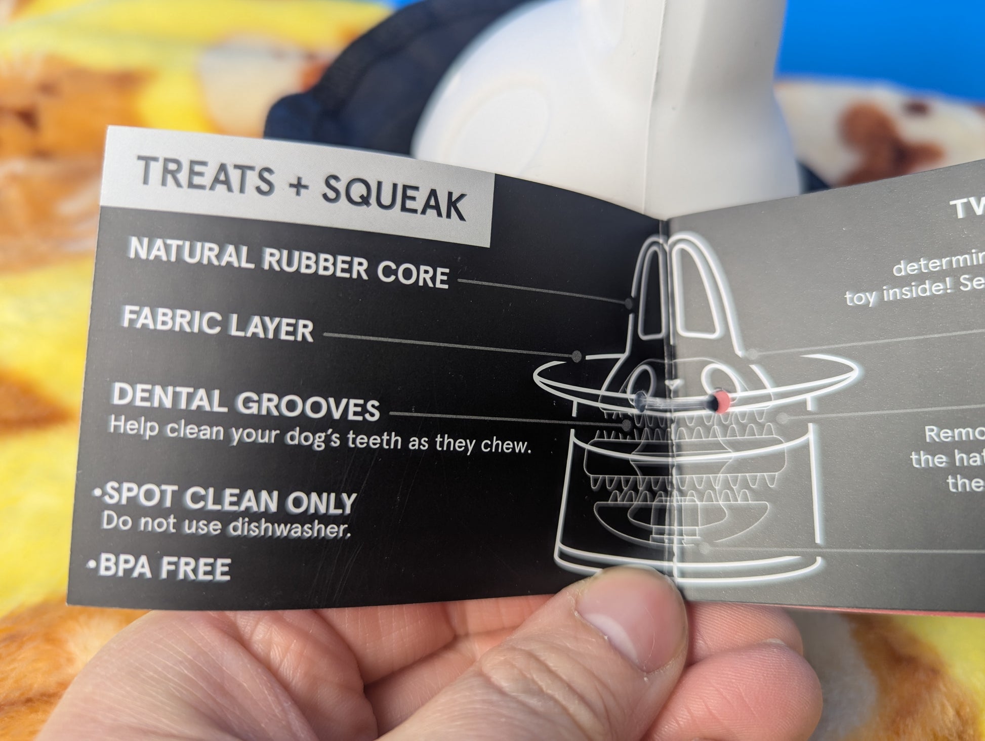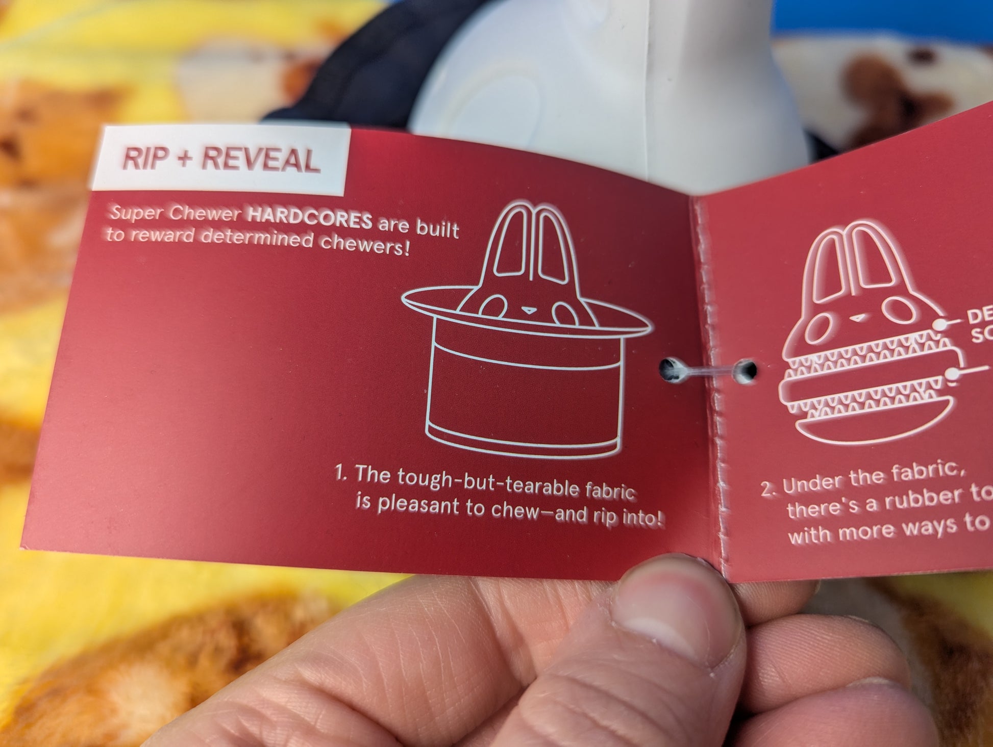 Super chewer, rubber core, fabric layer, dental grooves, treat dispensing, squeaker