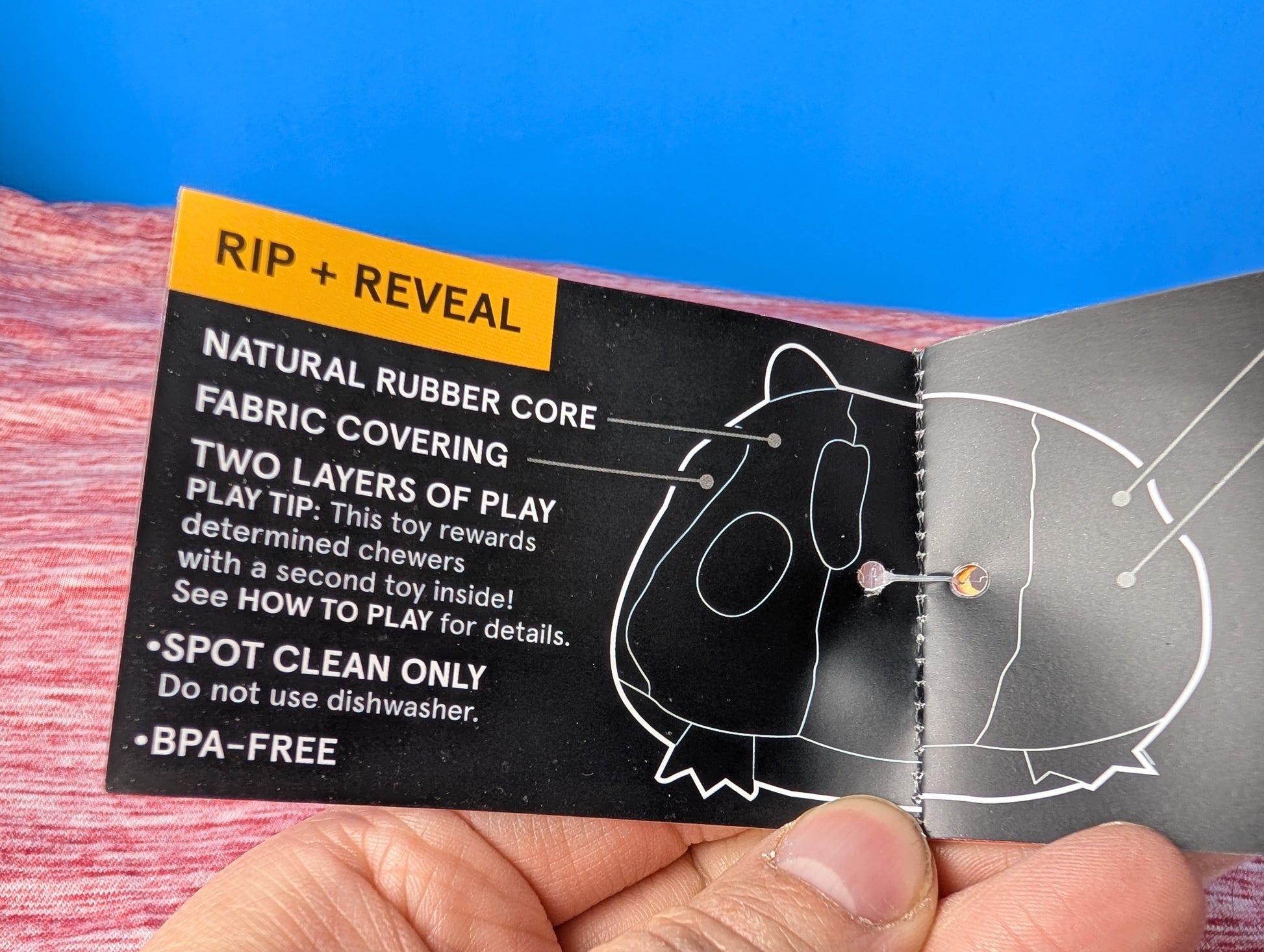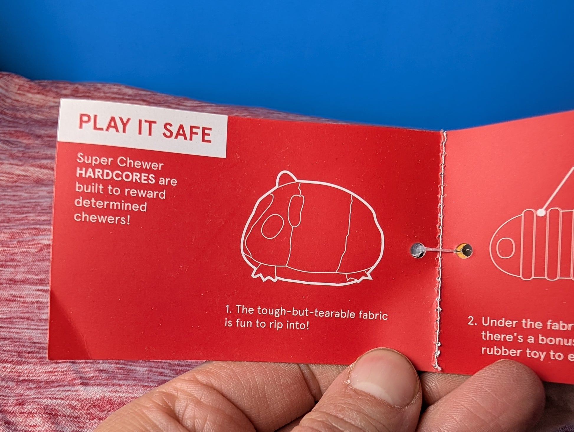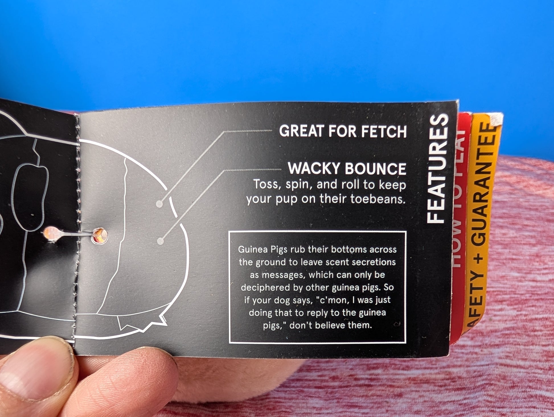 Super chewer, rubber core, fabric covering( two layers of play ), wacky bounce
