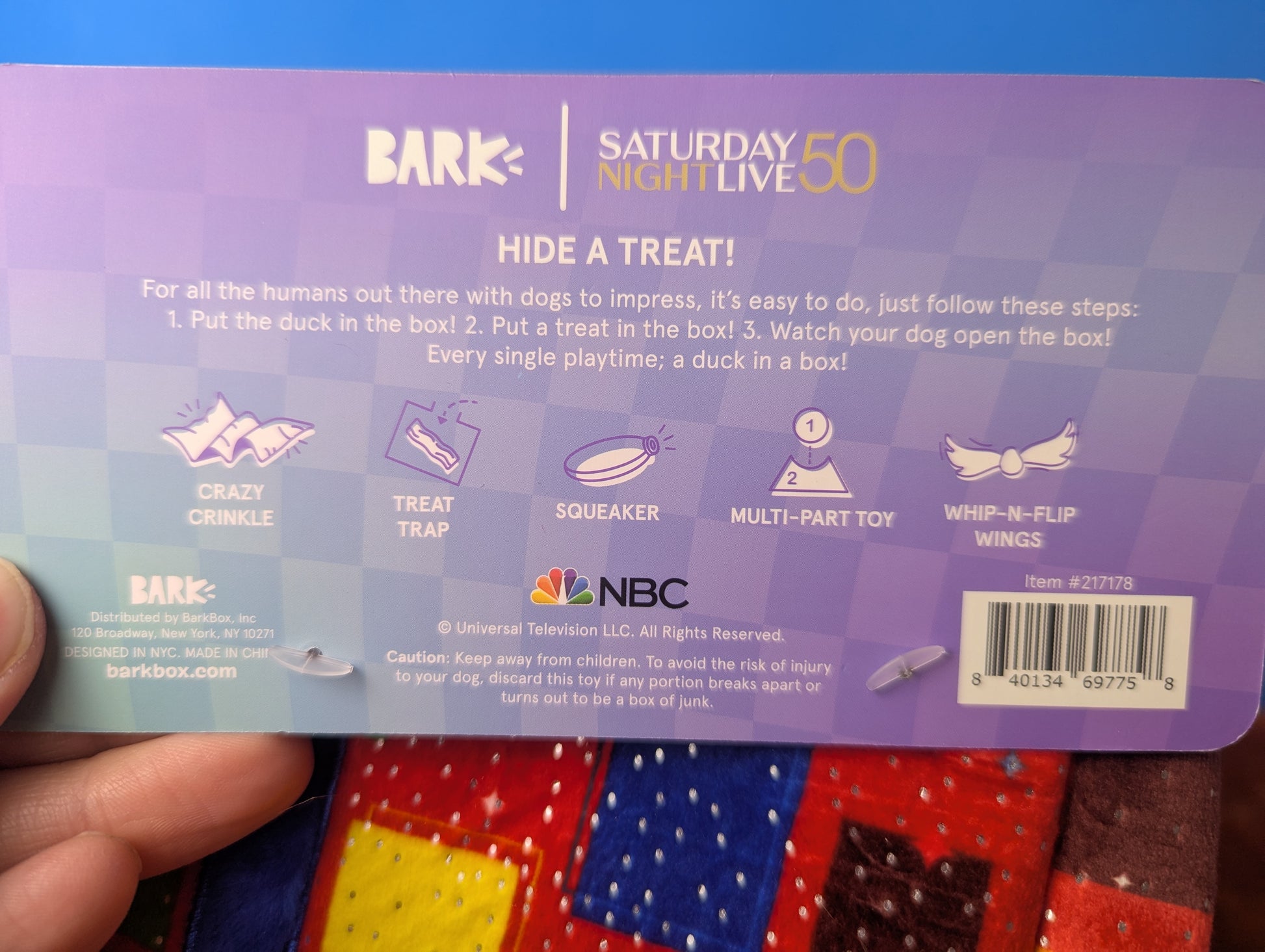 Disclaimer: Wesley's Treasures is not associated, authorized, endorsed by, or in any way officially connected with BarkBox. The names "Duck in a Box ", "BarkBox", "Bark" as well as related names, marks, emblems and images are registered trademarks of their respective owners. Wesley's Treasures stands independently as a seller of secondhand items.
