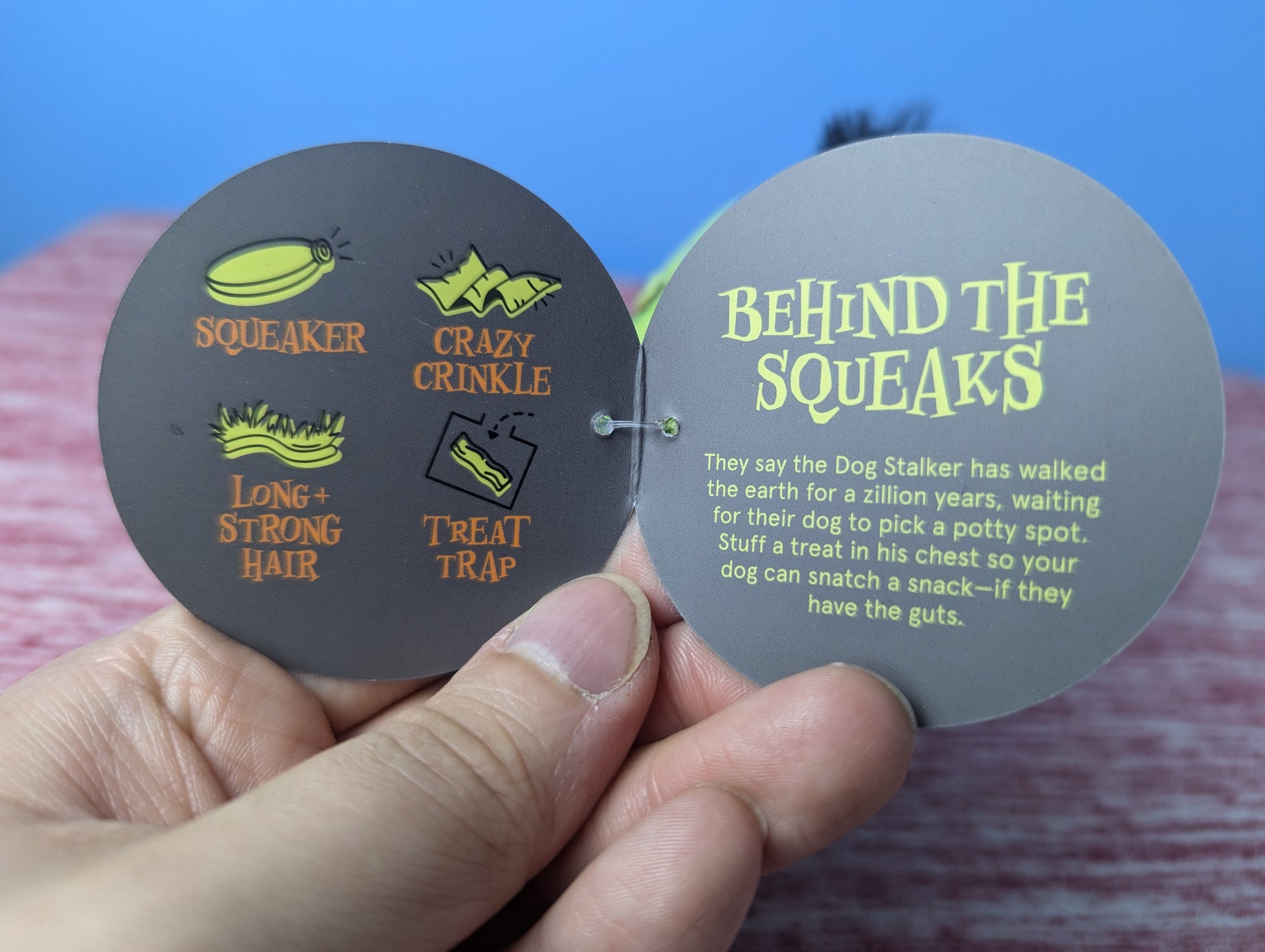 Squeaker, crinkle, treat trap (hide treats in his belly)